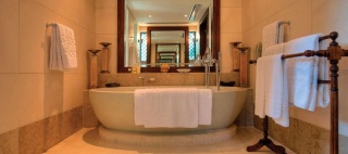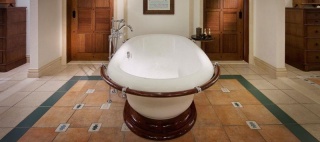 Ванная комната огромных размеров отделана мрамором и оборудована душевой кабиной с ливневым душем и стеклянной дверью. Гости могут пользоваться также отдельной ванной изысканной формы и косметическими принадлежностями класса люкс.